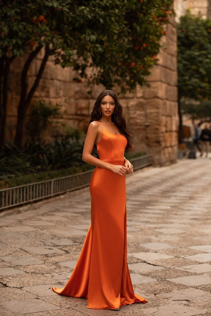 Look beautiful & vibrant in the Emilita Satin Gown. This gorgeous orange velvet satin gown features a scoop neckline, thin straps & side slit. Made from luxe fabric to hug your body & make you feel flawless. The colour will make you glow & stand out from the rest.