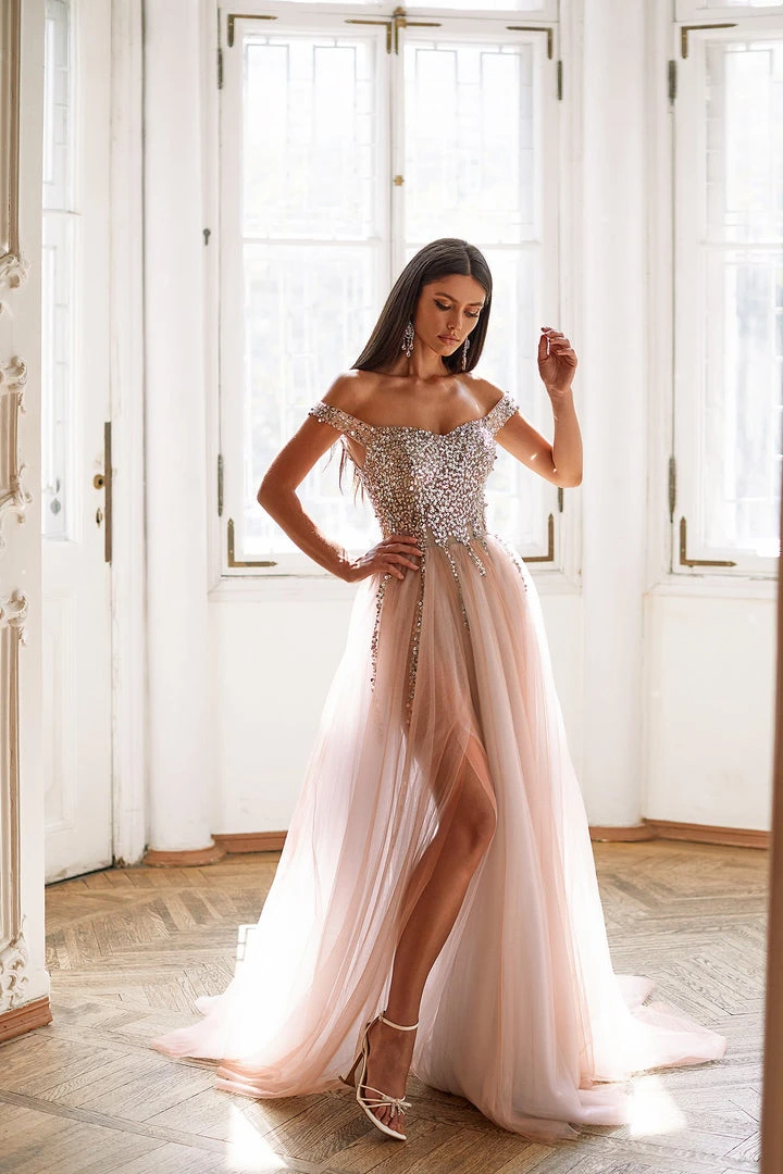Look incredible in the Yaritza Beaded Gown. This luxe gown features off-shoulder straps, a sparkling beaded bodice & dreamy a-line layered tulle skirt with a slit. Please note: this tulle is duo-toned with silver and nude fabric.