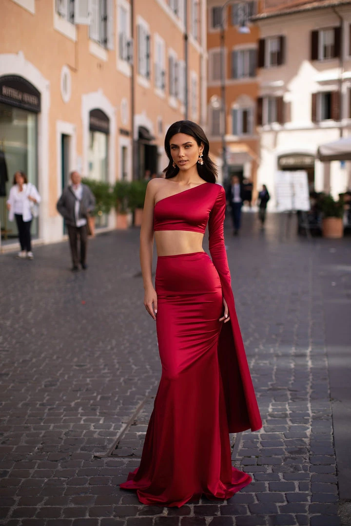 This modern two-piece design will captivate onlookers. Miya is made from silky red satin & features an asymmetrical one-shoulder long flare sleeve with ruched detailing on the back skirt.
