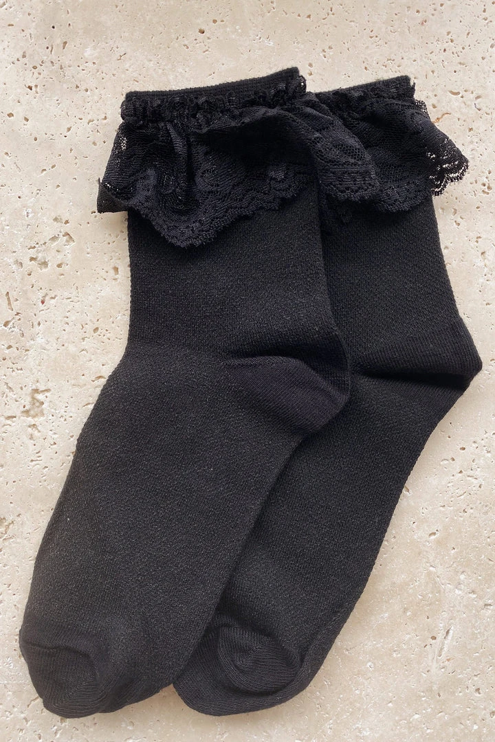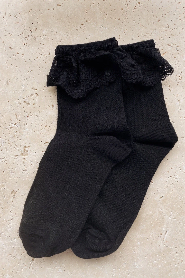 Elevate your winter wardrobe with the Black Cotton Lace Frill Socks. Made from cotton and accented with a lace frill. These socks will be the perfect addition to your look.