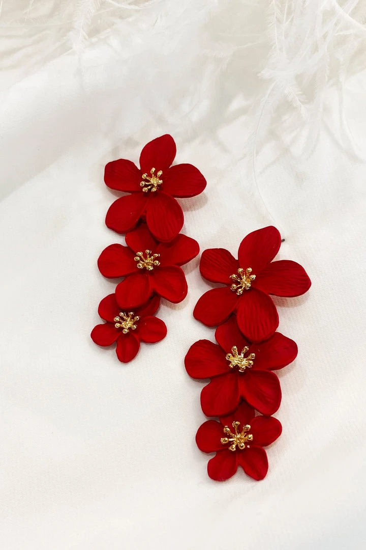 The Carola Red Multi Flower Earrings are the perfect accessory to accentuate your look. This triple flower design with gold centers is a must-have.