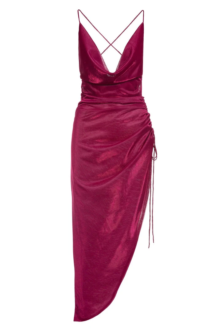 The Vallara Dress is the epitome of style. This shimmering mesh midi dress is produced from a gorgeous iridescent fuchsia fabric. It features a cowl neckline, lace-up back & an adjustable ruching side slit. Feel like a goddess when you arrive in Vallara.