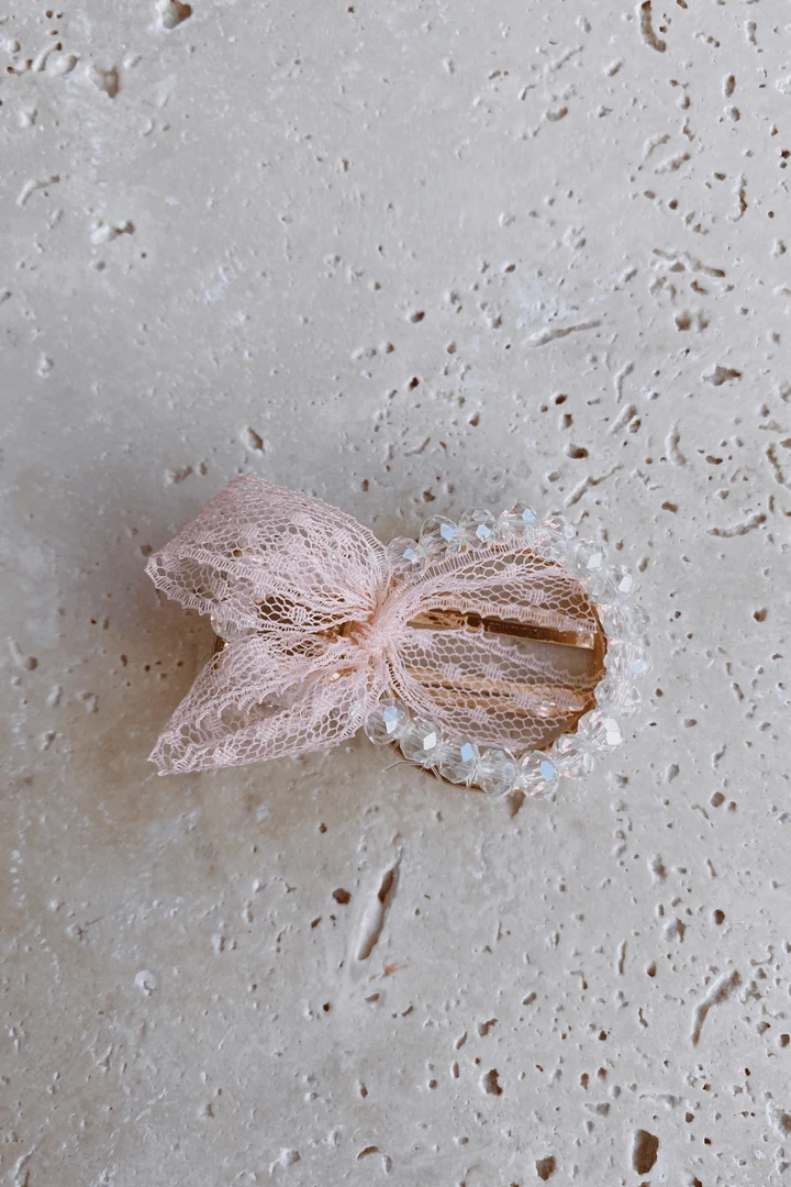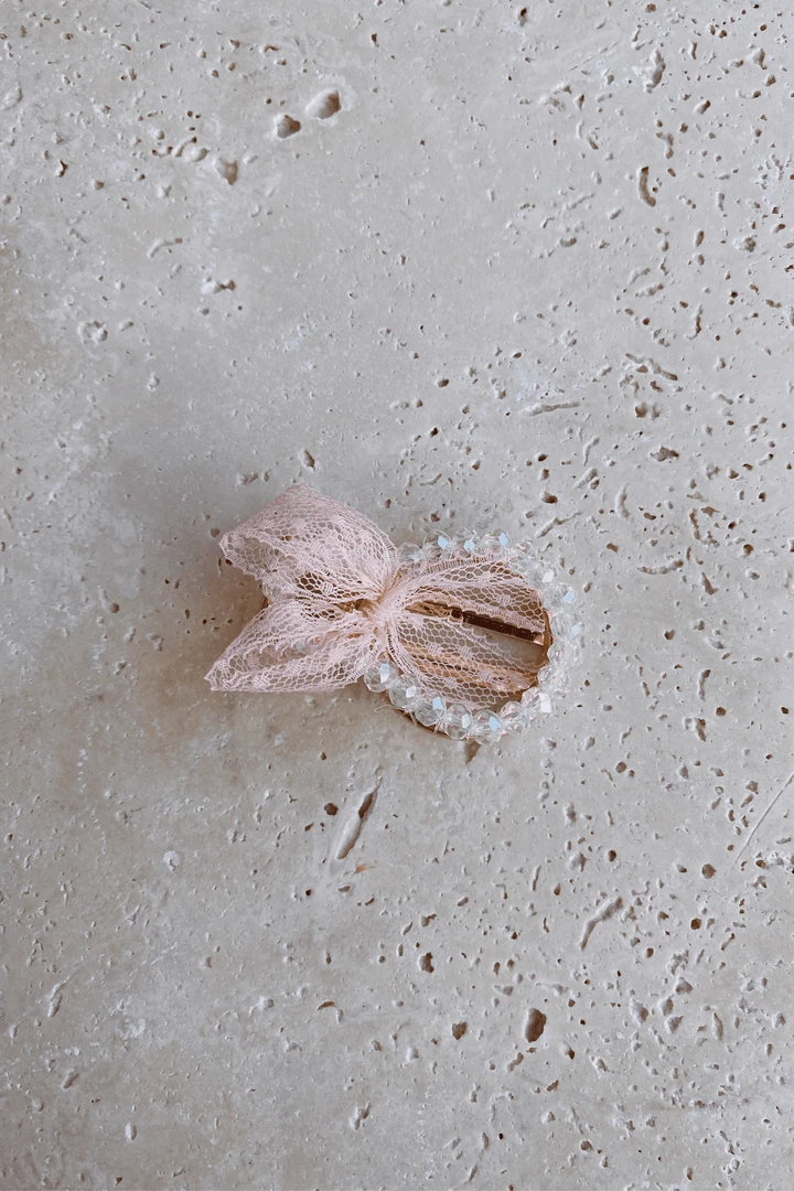 The Crystal Circle Hair Clip with Light Pink Ribbon Detailing is perfect. It features a unique circle design with crystal and pink ribbon detailing. We love pairing this style with our simple gowns.