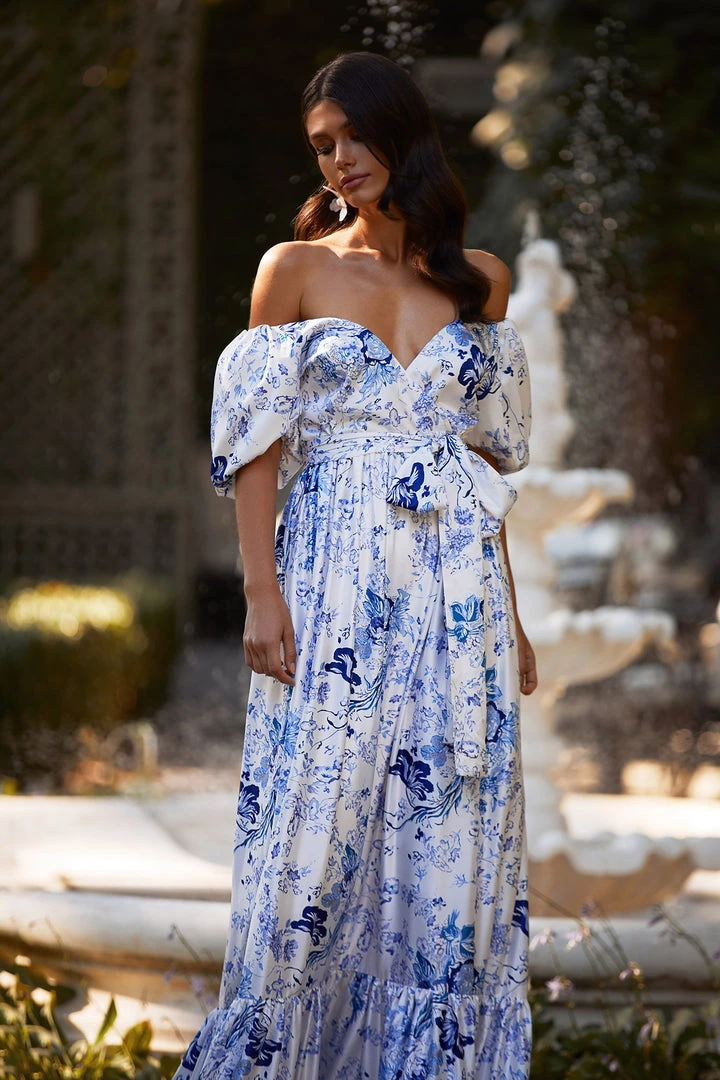 The Dara Dress is made from white & blue floral print fabric & features off-shoulder puff sleeves, wrap around waist tie & flowing a-line maxi skirt. You can wear this style on the shoulder or off the shoulder like in the picture.