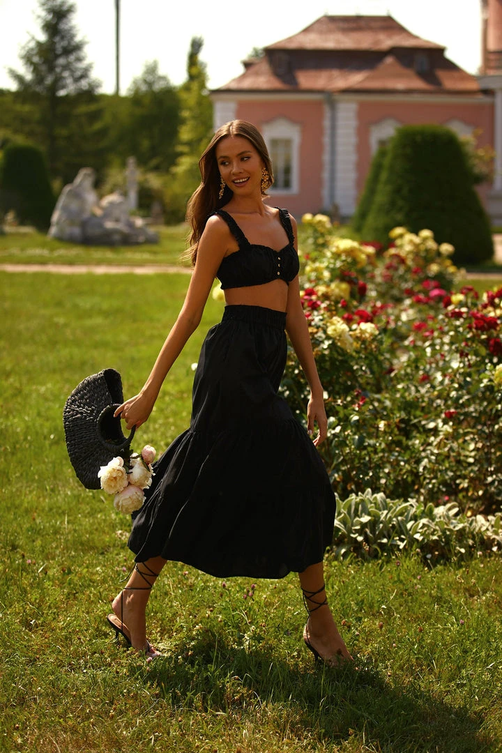Classy and elegant, the Ember Set embraces femininity with its two-piece design, ruched bustier, and a-line skirt. Elevated with gold-toned buttons and detailed straps. Crafted from a cotton poplin fabric, this set will upgrade your wardrobe.