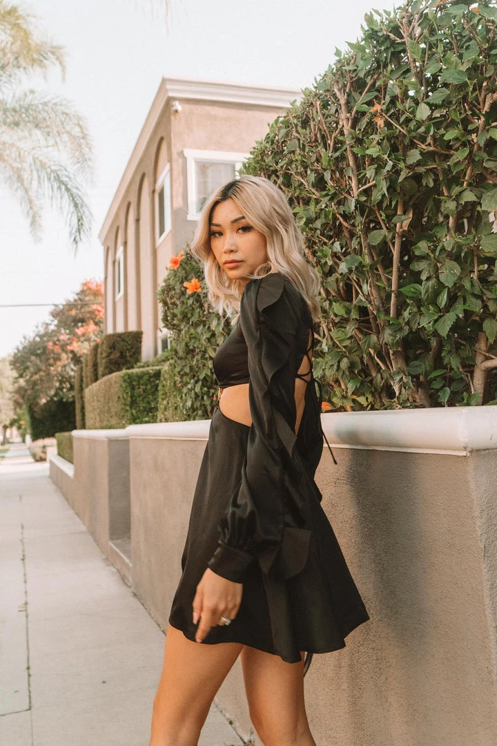 Alluring and ultra-feminine. The Romy Dress adds a flirty finish to your staple LBD. Designed with a lace-up back, side cut-outs to enhance your waistline, and our signature emblem piece. This mini dress was made to be shown off.