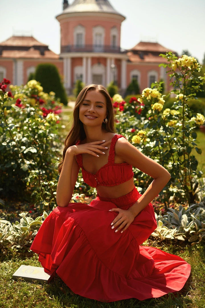 Classy and elegant, the Ember Set embraces femininity with its two-piece design, ruched bralette, and a-line skirt. Elevated with gold-toned buttons and detailed straps. Crafted from a cotton poplin fabric, this red set will upgrade your wardrobe.