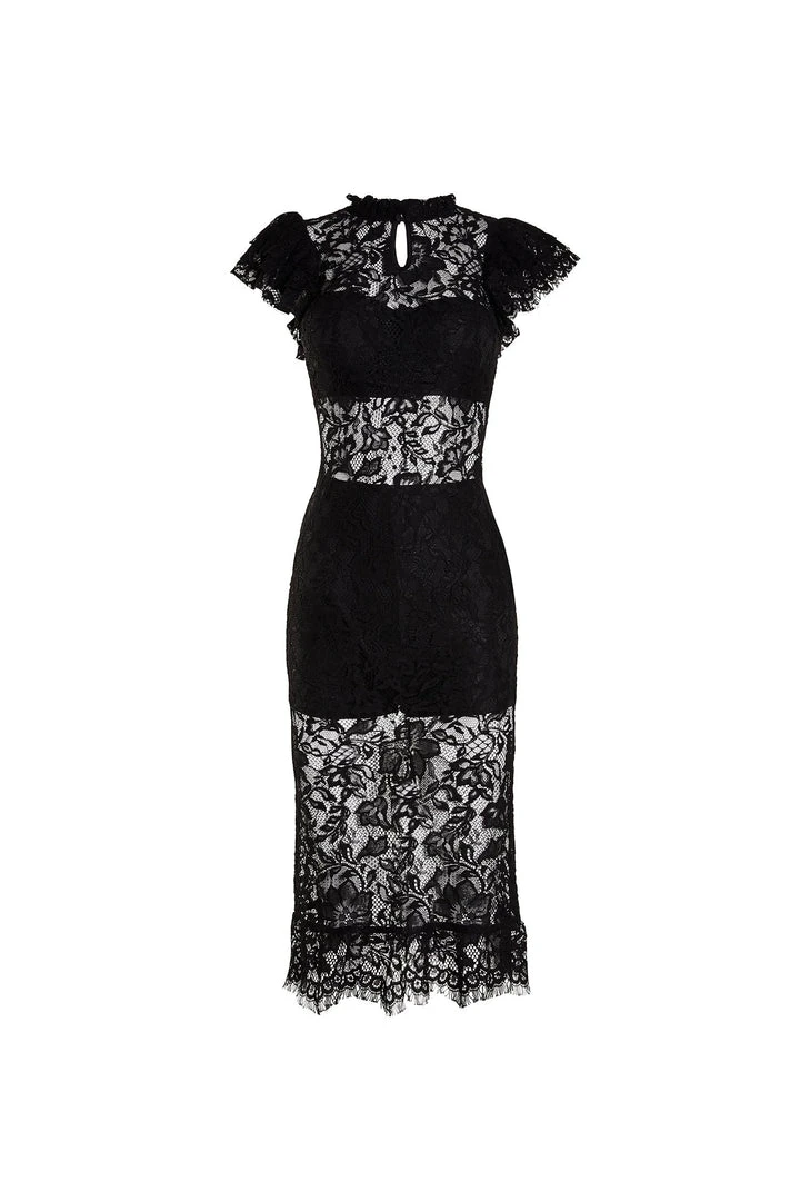 Channeling vintage glamour, the Francine Midi Dress adds a sensual touch with its sheer black lace fabric, high neck with keyhole, and bottom flounce. Paired with a detachable bandeau and shorts, this dress will leave a lasting impression.