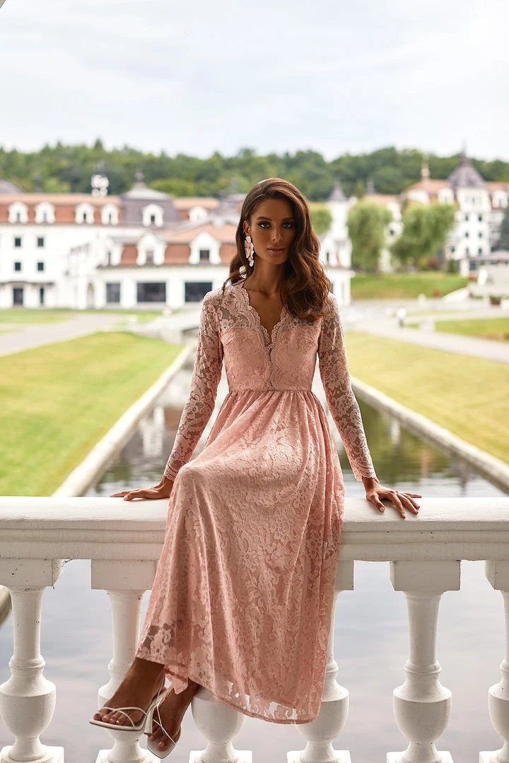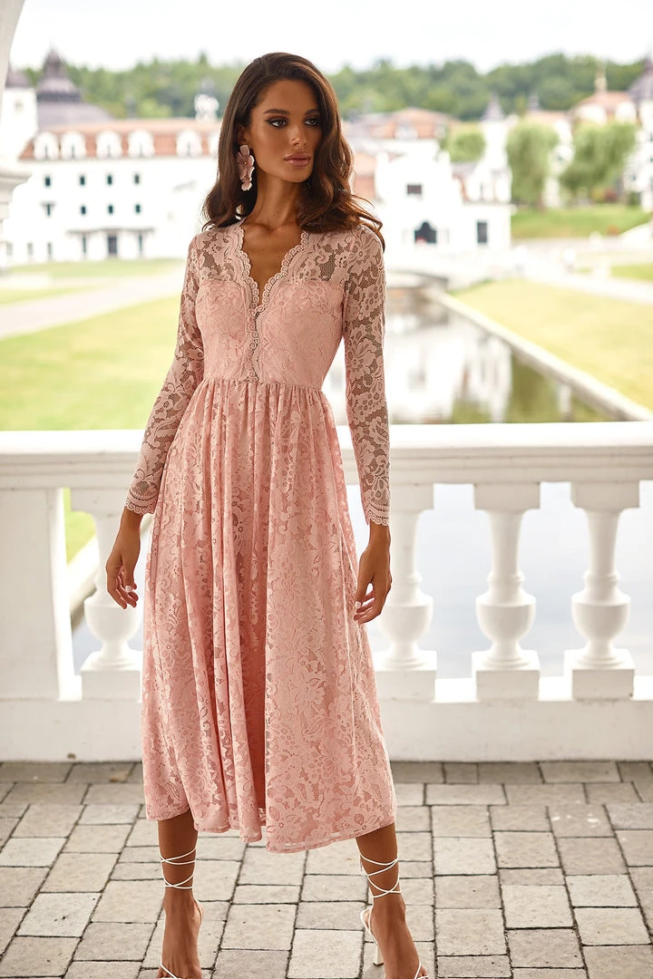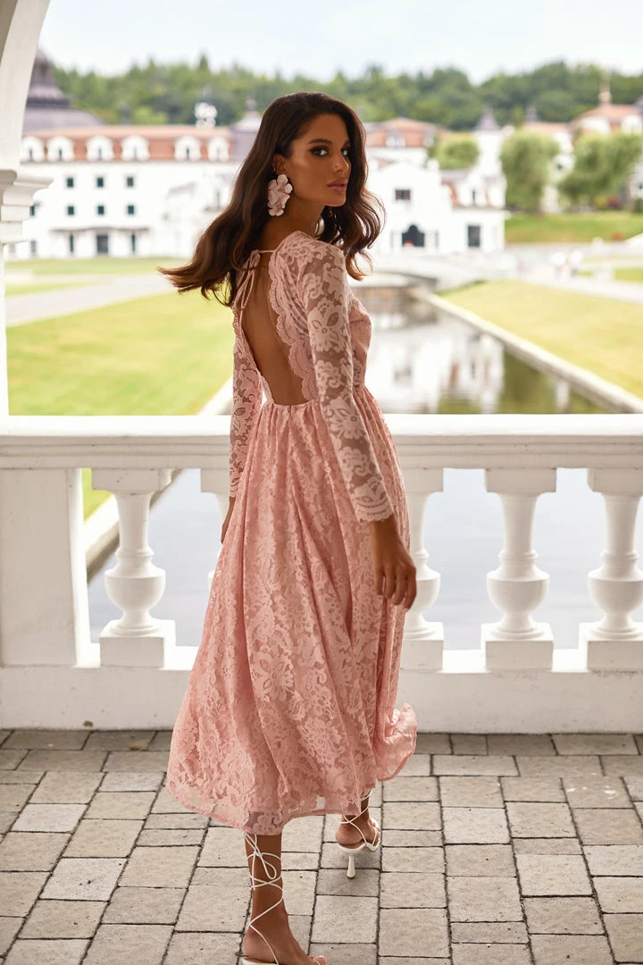 The Genevieve Dress takes a classic approach to your event wear with its lace fabric, semi-sheer long sleeves, and a-line silhouette. Elevated with an open back with a tied close at the back, the Genevieve Dress embraces femininity.