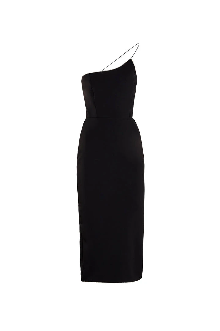 Black scuba fabric with diamante trim, thin double strap detail, zip back, asymmetrical neckline, back slit