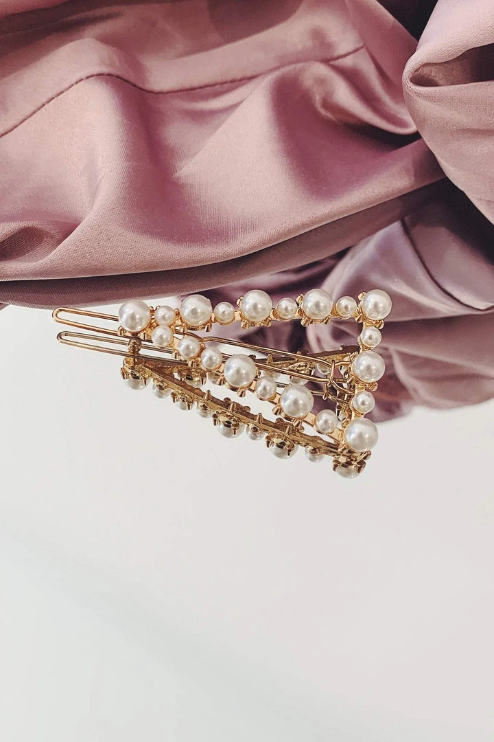 The Gold Triangle Clip with Pearl Detailing adds a touch to class and elegance to any look. Featuring a delicate gold frame and multi-size Pearl detailing, this style pairs perfectly with our simple gowns.