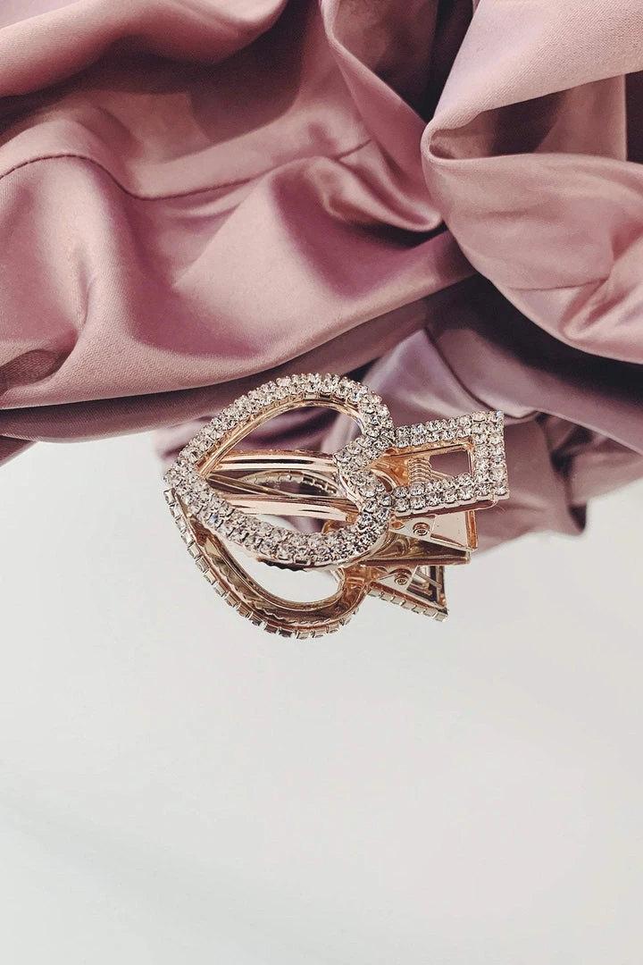 Glam up your next formal look with the Rose Gold Crystal Heart Clip. Encrusted with rose gold, crystal details, this style pairs perfectly with our simple gowns.