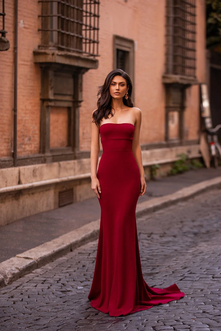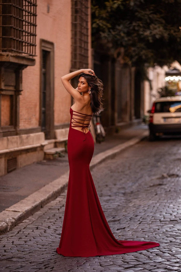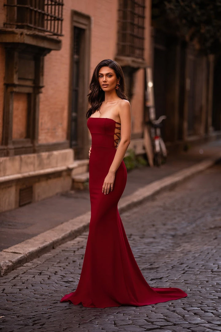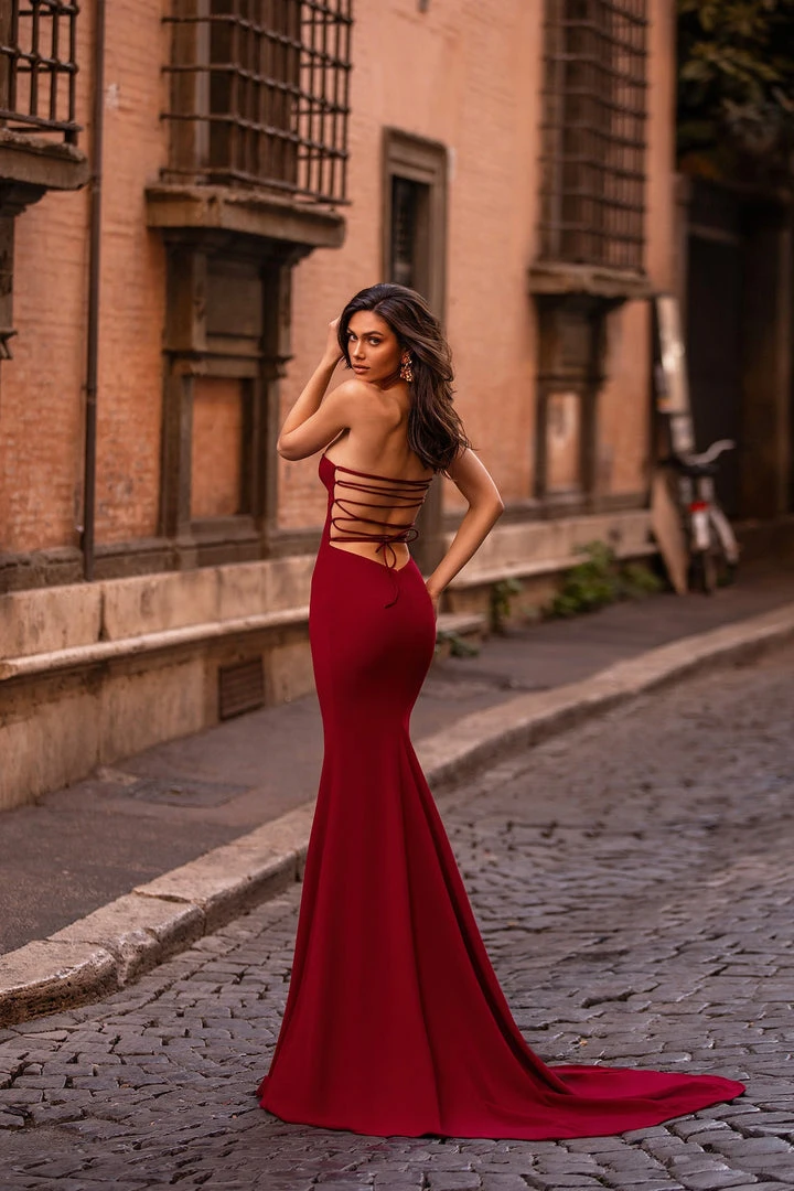 Wow the crowd from every angle in the stunning Halina Gown. This strapless wine red gown will make you look like a total bombshell. Features an incredibly sexy lace-up back and is complete with a mermaid train, for making a grand entrance.