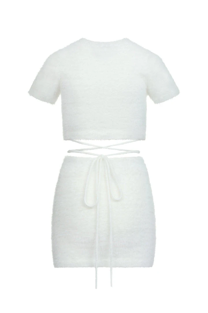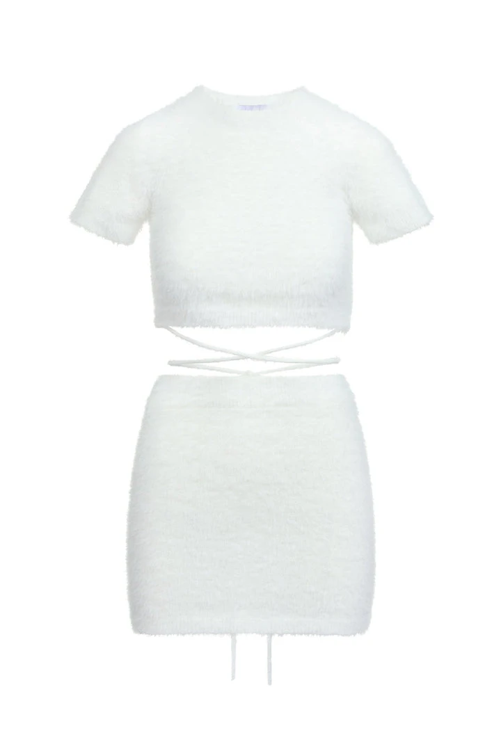The Jelena Set brings elevation to your standard loungewear with its two-piece design, waist ties, and fitted silhouette. Made from fluffy white fabric with a crew neckline, the Jelena Set is the perfect versatile set.
