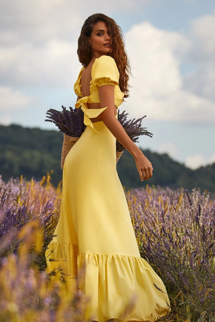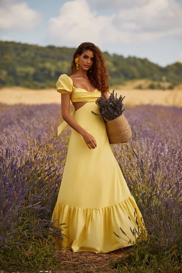 The epitome of effortless summer styling. The Kasia Dress features a bustier with tuck pleats, side cut-outs, and bow tie back. With an a-line silhouette and puff sleeves, this poplin maxi dress brings in all the attention with its bright yellow hue.