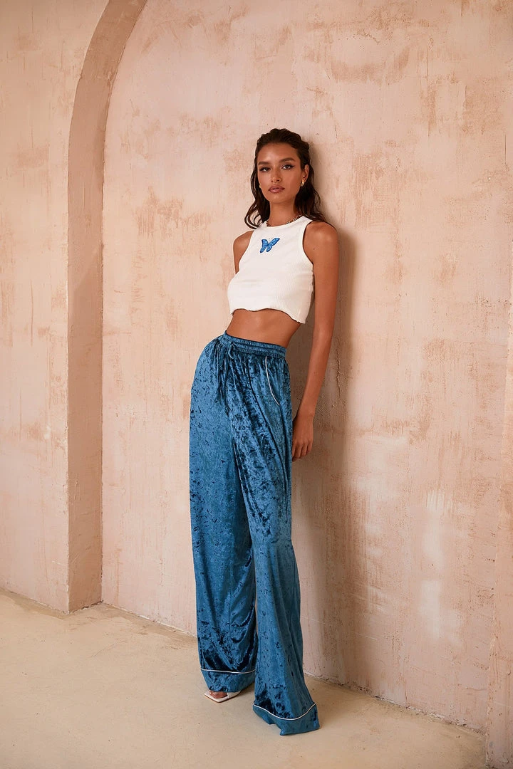 The Lais Tank is your dream summer top! Made from white ribbed fabric, tank style cut & features a raw cropped hem with a teal butterfly print. Pair with the Miranda Pants or your favourite bottoms.