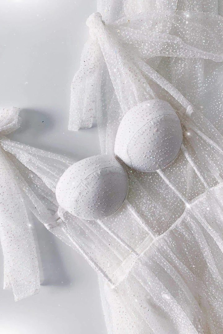Exquisitely beautiful, the Laurinda Glitter Gown is the dress of your dreams. With sheer glitter tie-up straps, padded bustier with boning & sheer waist & skirt, this gown is designed for making an entrance & leaving everyone breathless. With dreamy shimmering pastel glued-glitter all over, this gown will sparkle in the light and make you feel like an angel. Also features a side slit & sewn-in booty shorts.
