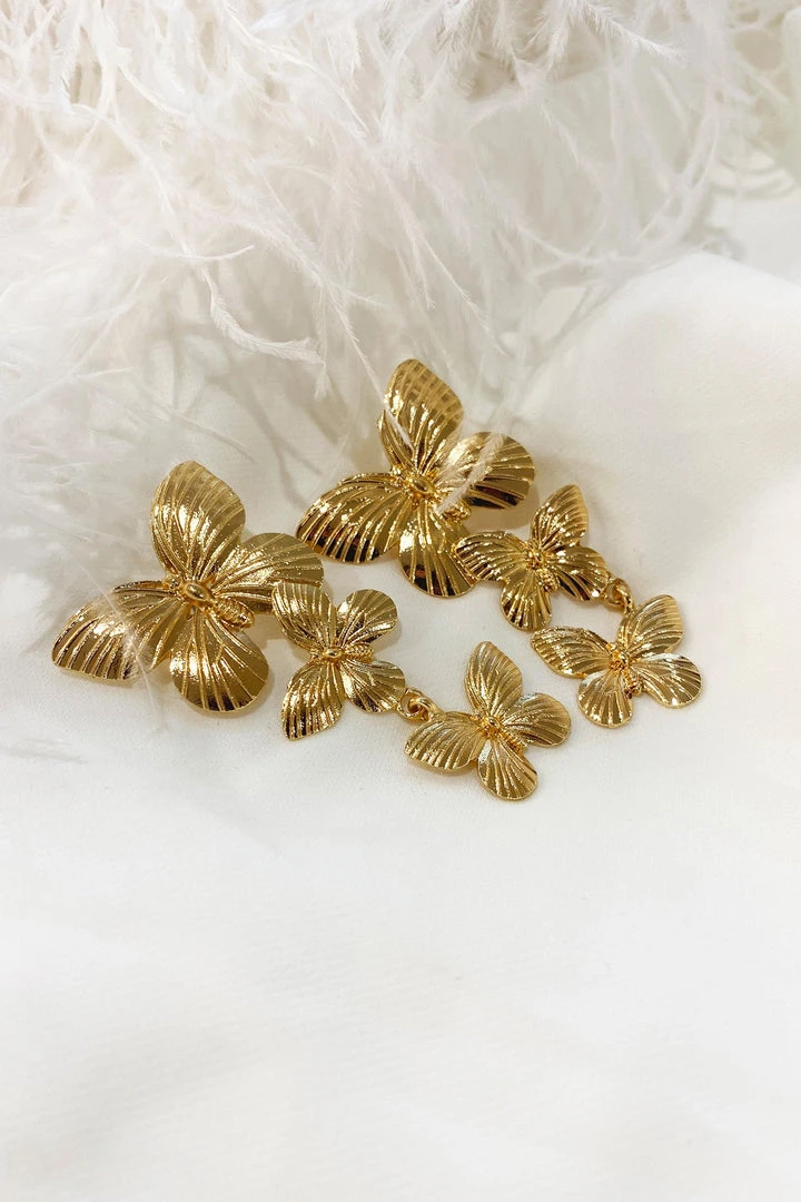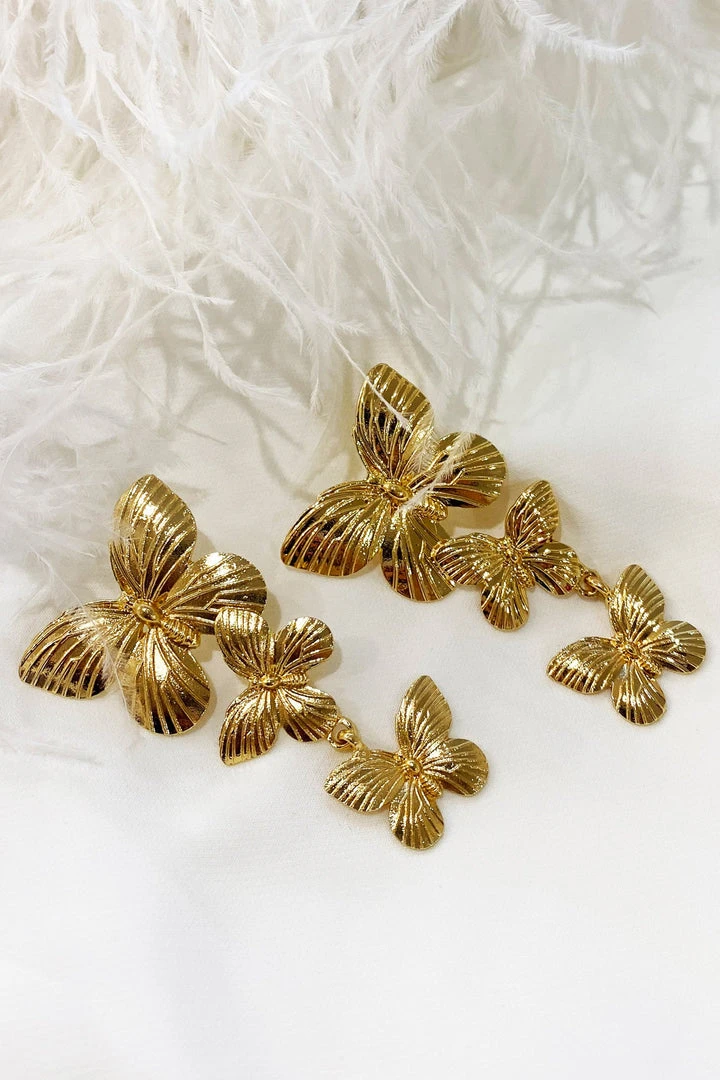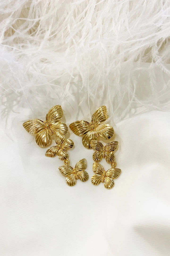 The Lolita Gold Butterfly Drop Earrings will be the perfect accessory to your resort wear. Featuring gold hardware with butterfly details, these earrings will elevate your look.