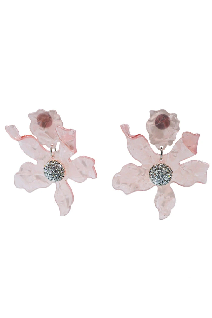If you love a good statement earring, the Luna Flower Earrings are perfect for you! Featuring gold hardware with a pink acrylic flower and tiny sparkling diamanté detailing in the center.