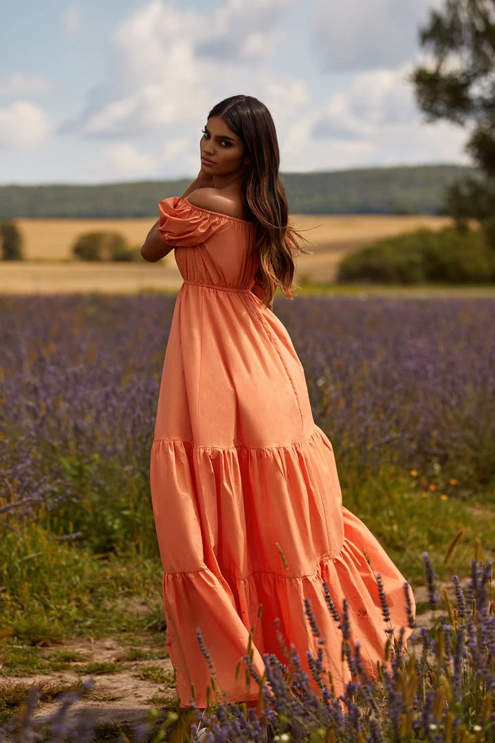 The Marni Maxi Dress showcases a bright orange hue in a lightweight cotton poplin fabric to ensure optimum breathability. With sweet off-shoulder sleeves, dainty button detailing, and an a-line silhouette, this maxi is a stand-out option for your summer wardrobe.