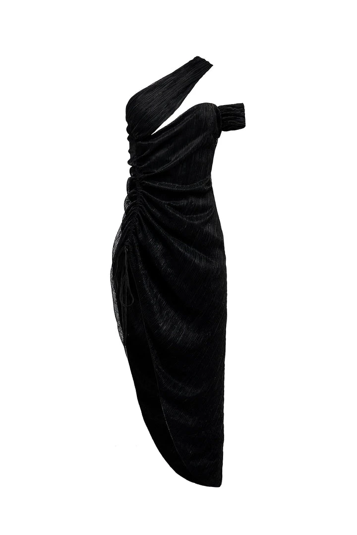 Symmetry was not an option when designing the Matilda Dress. Bearing an asymmetrical neckline, draped bodice, and adjustable side slit and rendered from a light-catching mesh fabric, this midi dress was created for those who love to bring a fashion-forward statement to their wardrobe.