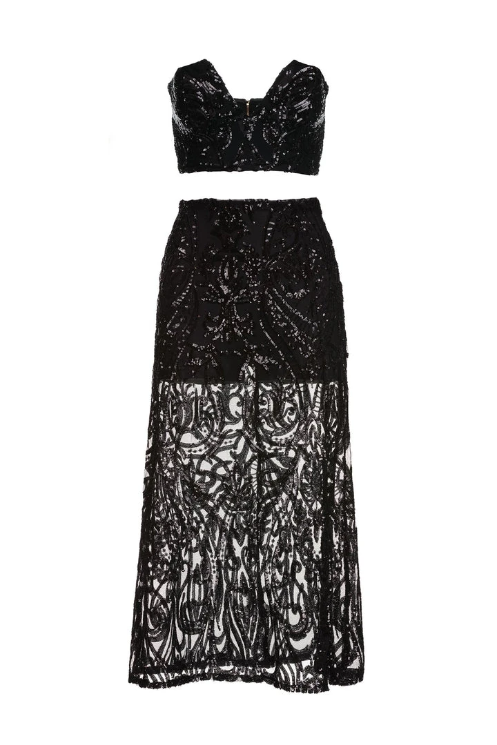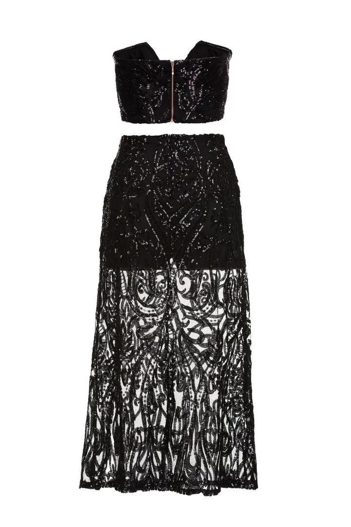 Dance the night away in the Mauris Set. Made from black sequin fabric & features a cropped strapless v-neck bustier with a matching semi-sheer midi skirt. So glamorous.