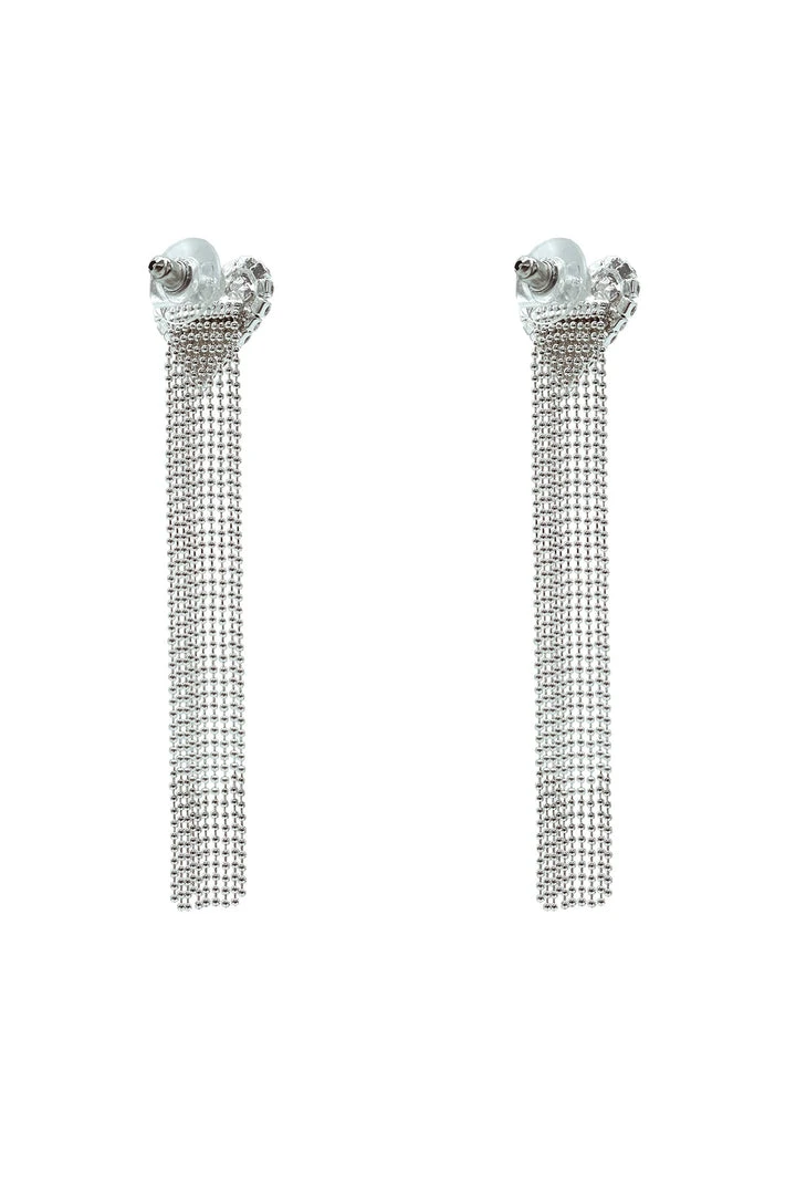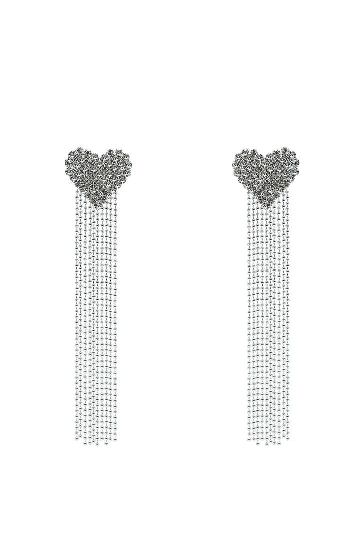 The Monique Earrings are decorated with embellished heart studs and cascading silver chains. Elevate your look this season with the Monique Diamante Heart Earrings.