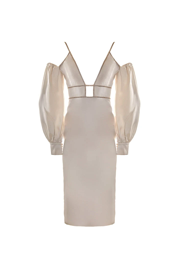 The Chloe Dress is designed with alluring cut-outs on the neckline and sleeves, intricate diamante trimming, and exaggerated puff sleeves. Cut from a luxurious duchess satin fabric with a fitted form to compliment the body’s natural curves. The Chloe Dress was made with your luxury events in mind.