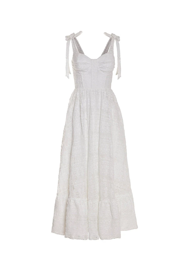 The Katia Dress encapsulates summer glamour with its detailed lace fabric, adjustable bow sleeves, and bottom skirt flounce. Inflect your warm-weather edit with an elevated notion of bohemia with the Katia Dress.