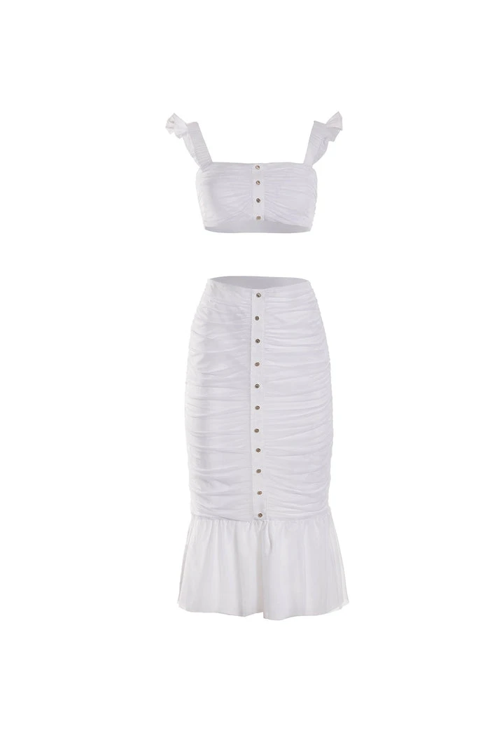 This body-hugging two-piece set brings an alluring appeal to your event look with each refined detail. Created with frill sleeves, a bottom flounce on the skirt & dainty Alamour embellished buttons that cascade down the middle. Rendered with a ruffled mesh fabric that will flatter the female form, the Margot Set was made to please.
