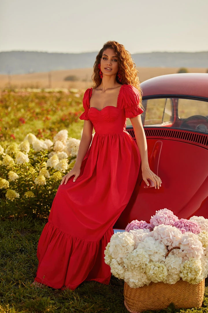Add a pop of colour to your summer wardrobe with the Noelle Dress. With a ruched bustier, a-line silhouette with a bottom flounce and a crowd favourite lace-up back. This maxi dress will be the perfect option for your summer wedding events.