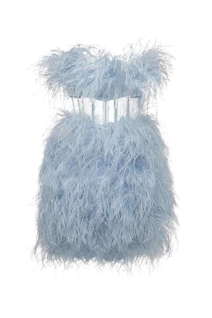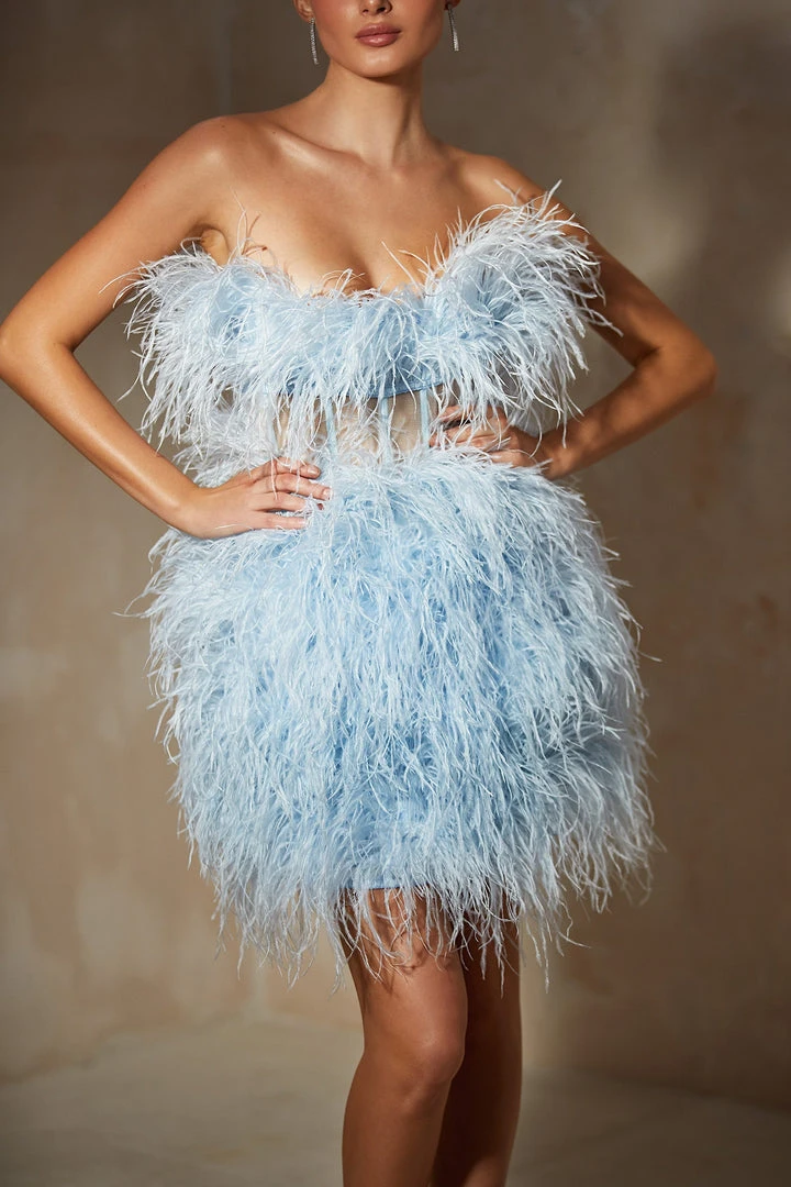 To make a captivating impression at your next event, consider the Paige Dress. Made from lavish ostrich feather fabric with a sheer bodice that cinches the waist to create an hourglass silhouette. Formed with a strapless neckline and situated at a mini length, the Paige Dress will redefine your wardrobe.