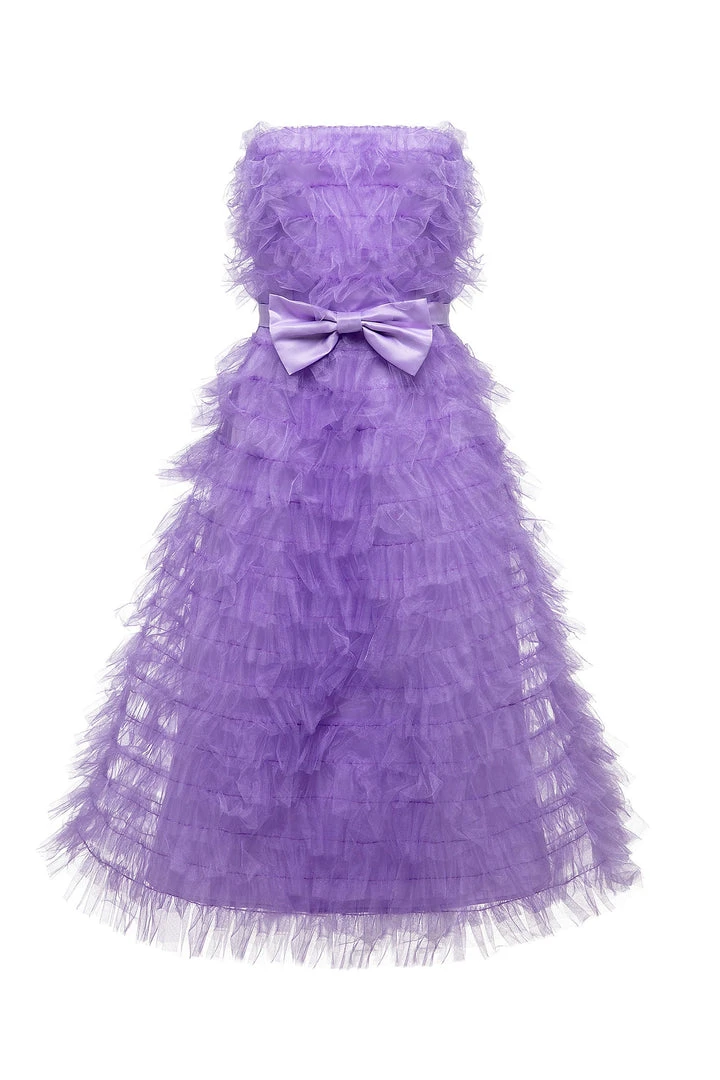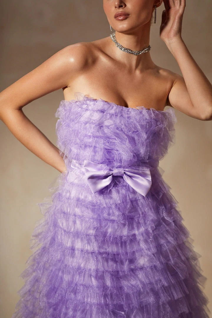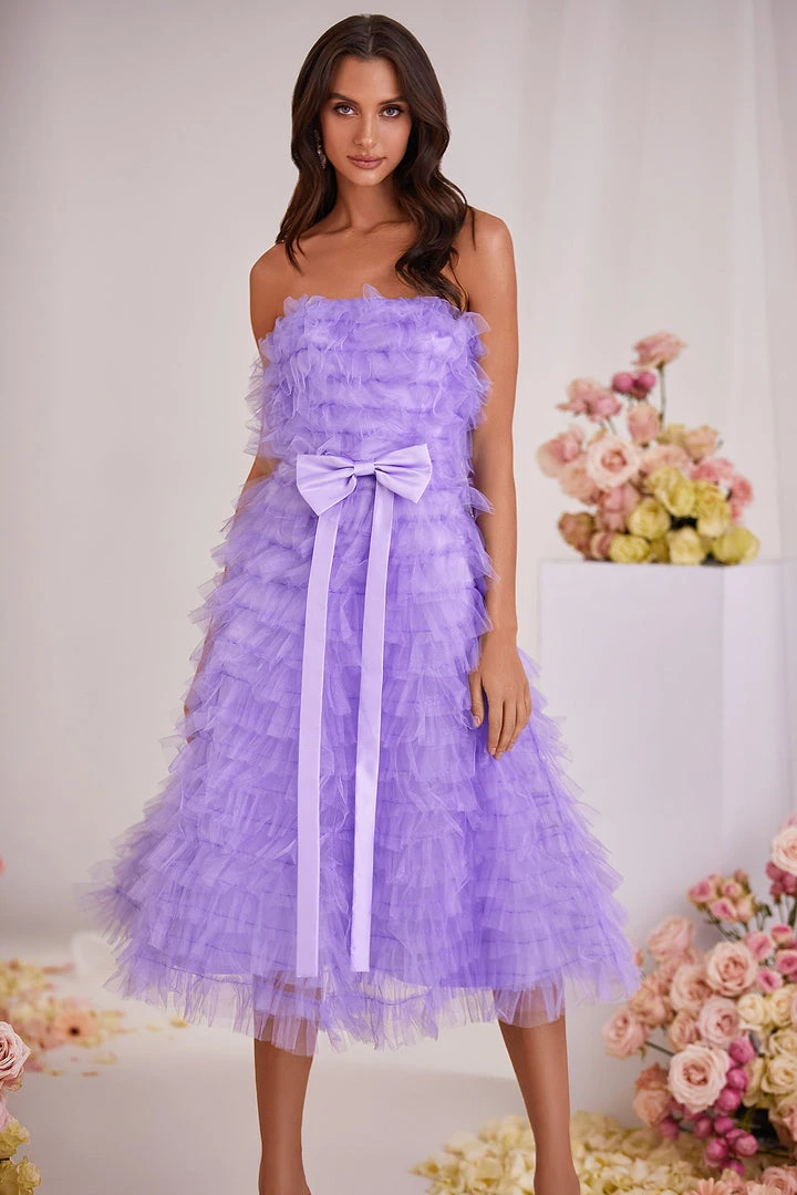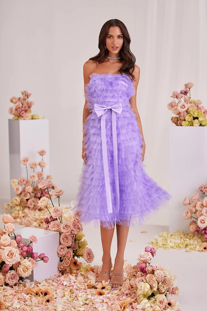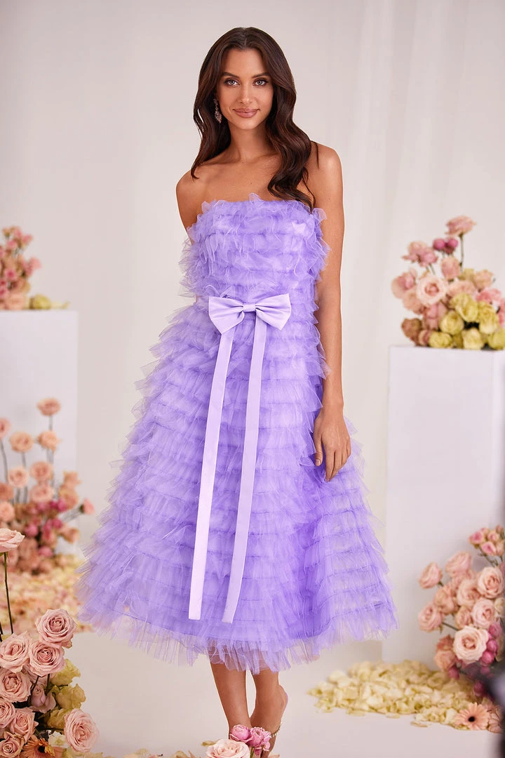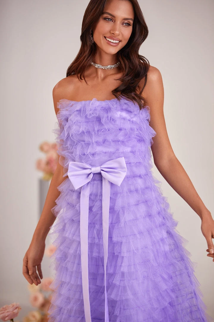 Taking a modern approach to your look, the Tiana Dress brings both glamour & style to the forefront. Made from a frothy tulle fabric with tiered layers and a sewn-in bow belt. Complete with a strapless neckline that cascades down to a below-the-knee length. Reinvent your style with the Tiana Dress.