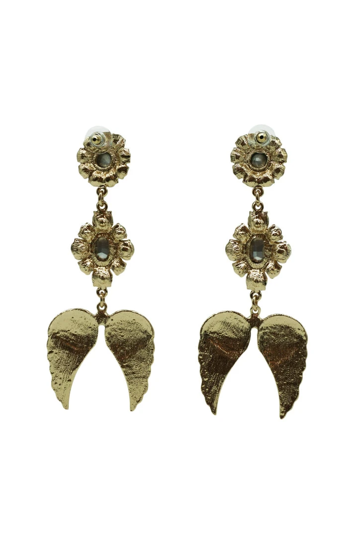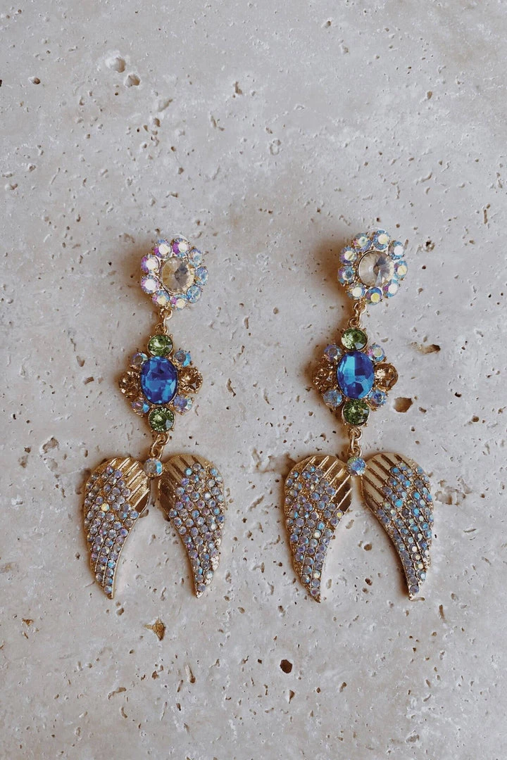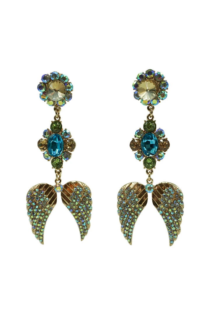 Introducing the Zabrina Multi Crystal Statement Earrings. This design features a blend of ocean coloured gems with a stunning gold hardware. These earrings will complete almost any gown perfectly.